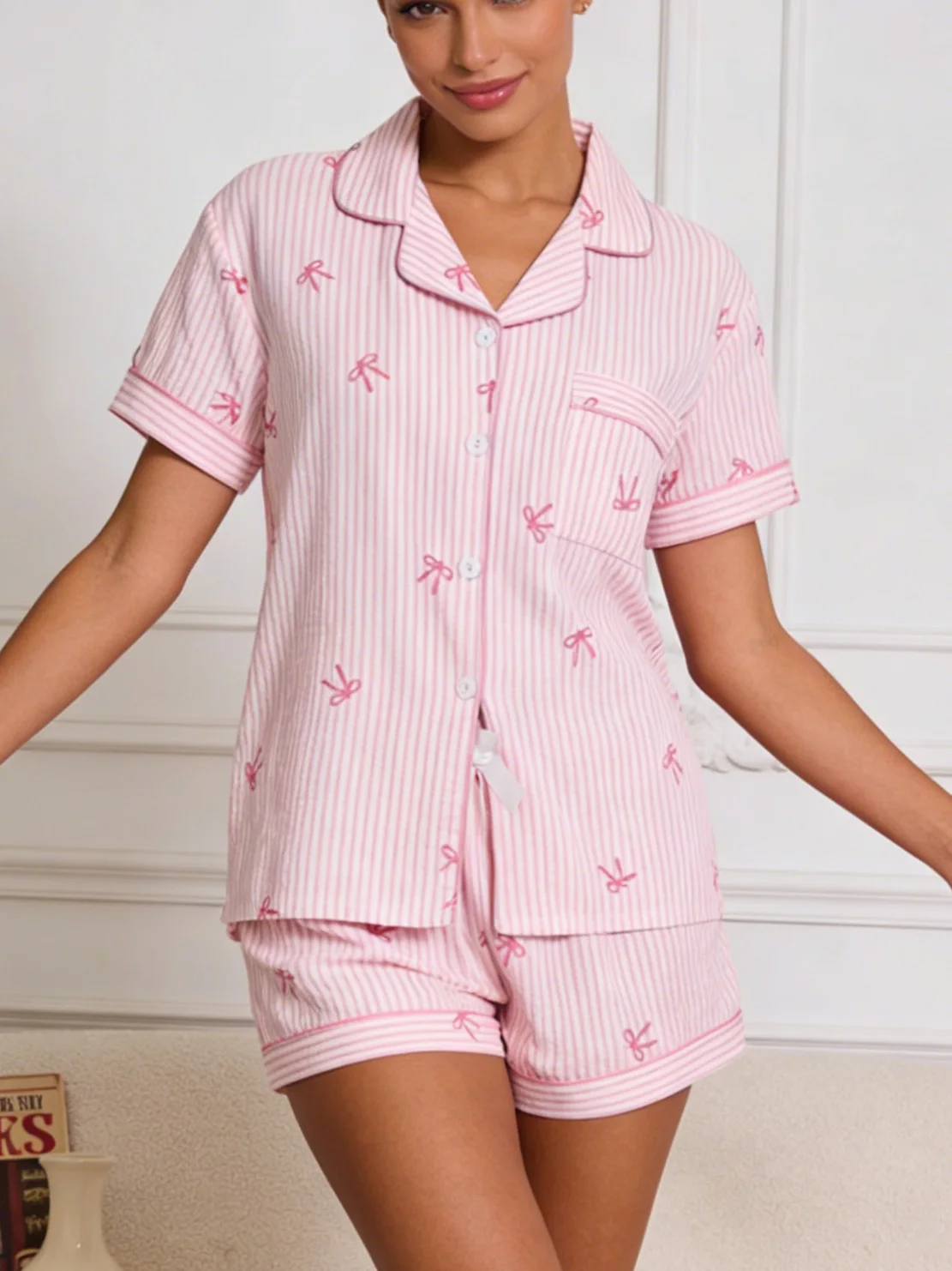 Ensemble Pyjama Femme 2 Pièces – Cardigan Rose à Rayures & Nœud Manches Courtes 🎀